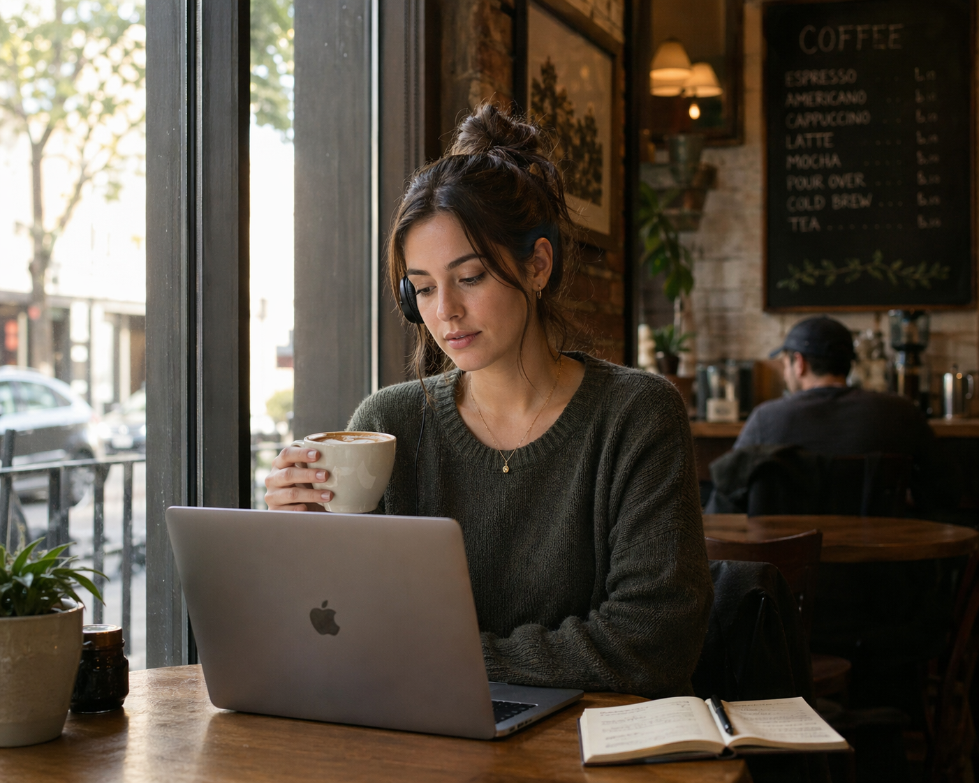 Mid-afternoon, independent coffee shop, ambient music, relaxed vibe. She's sitting alone at a small table near the window, MacBook open, sipping a latte. She's wearing headphones but one ear is uncovered.